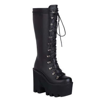 WETKISS Women's Black Goth Platform Shoes Midi Punk Boots Chunky Heels for Autumn Winter Comfortable Wedge Rock Boots